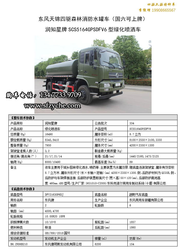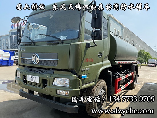 東風(fēng)天錦四驅(qū)森林消防灑水車_國六排放潤知星牌SCS5164GPSDFV6型四驅(qū)越野綠化噴灑車采用DFV2163GP6DJ型國六排放東風(fēng)天錦四驅(qū)越野底盤,東風(fēng)天錦D530一排半駕駛室,4×4驅(qū)動(dòng),康明斯B6.2NS6B210國六發(fā)動(dòng)機(jī)210馬力,最大扭矩850N.m/1100-1700rpm,排量6.2L、韶齒手動(dòng)六檔變速箱,東風(fēng)德納車橋,前驅(qū)動(dòng)橋4.5噸,后橋10噸,10.00R20輪胎,軸距4500mm/4700mm,電動(dòng)玻璃,方向助力,斷氣剎,ABS,大燈自動(dòng)調(diào)節(jié),自動(dòng)調(diào)整臂,選裝原廠空調(diào)。罐體采用優(yōu)質(zhì)碳鋼Q235板材,板材厚度4mm,罐體容積8.7立方,安裝夾心取力器,后置泵箱,消防栓接口左右各一個(gè),消防炮采用PS30-50D消防水炮,流量40L/S/1.0MPa 水射程:≥50m,消防泵采用常壓消防泵型號(hào):CB10/40車用消防泵,流量:40L/s,壓力:1.0MPa,駕駛室頂部安裝長(zhǎng)條警燈帶喊話器,兩側(cè)噴涂白色森林消防字樣。