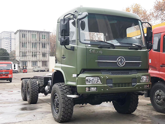 采用東風天錦D530一排半豪華駕駛室;驅(qū)動型式:6×6;外廓尺寸(長X寬X高)8430×2550×3100(mm);軸距4100+1300(mm);最小離地間隙360(mm);最小轉(zhuǎn)彎直徑19米,整備質(zhì)量底盤7.5噸、最大總質(zhì)量整車16噸;最高車速85km/h。發(fā)動機型號ISD245 50、國V排放標準直列六缸帶增壓、最大扭矩950/1200-1800(Nm/rpm)、排量6.7(L)、、變速箱型號8JS118、機械式8擋、分動箱帶差速鎖、帶軸間差速鎖;前橋總成型號6噸輪邊減速橋、中后橋總成型號10噸輪邊減速橋、主減速器速比5.921;ABS ;車架280×80×(8+4)mm;油箱容量(L)200L 、尿素罐容量(L)25L、輪胎型號365/80R20越野輪胎數(shù)量6+1、帶原廠空調(diào)。