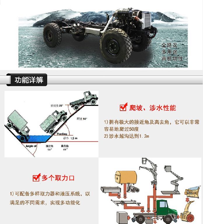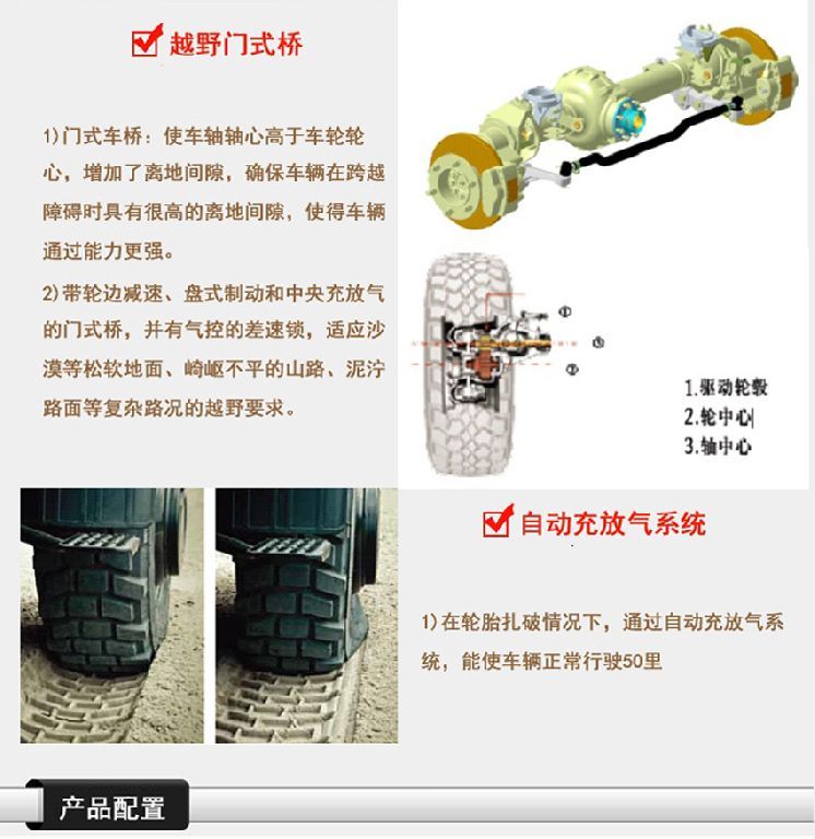 簡介:東風EQ2070FFZ4D型高性能越野特種車是一款技術先進、性能卓越、多功能、全天候的特種越野車,也是中國上唯一在沙漠、山區(qū)等極其艱苦環(huán)境條件下顯示高技術、高性能和高可靠性的軍用和特殊民用汽車。該產品,無論是越高山峻嶺、穿林海雪原,還是闖茫茫沙漠、涉沼澤泥潭,無論是用作防彈運兵、戰(zhàn)地救護,還是用作森林消防和野外勘探,它都能以超一流的越野通過能力、高涉水性,可靠耐久性和優(yōu)異的上裝適用能力,令世人嘆為觀止,當之無愧地成為挑戰(zhàn)越野極限的明星。如需了解更多EQ2070FZ4D型越野四驅汽車的詳細參數(shù)和配置請立即撥打銷售熱線:13477339709 李經理 0722-7053060 業(yè)務QQ:530233927,微信號:13477339709 ,東風越野卡車網址:m.lyhdxxkj.com